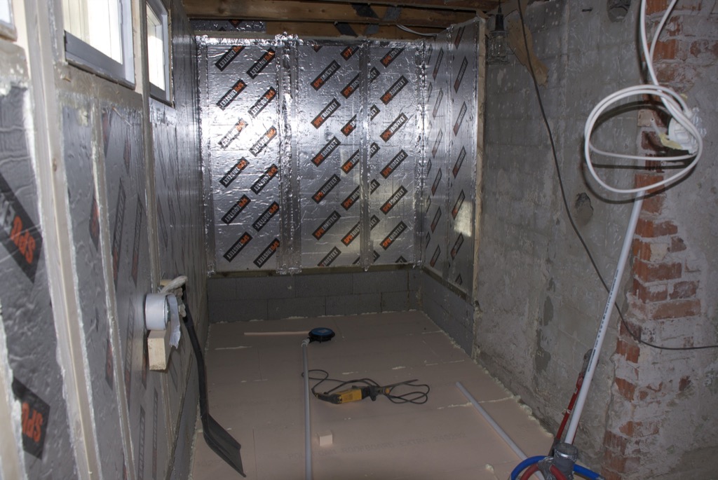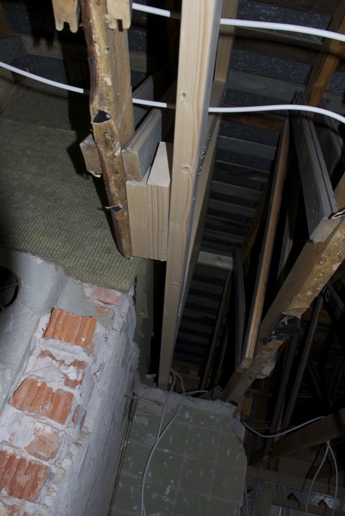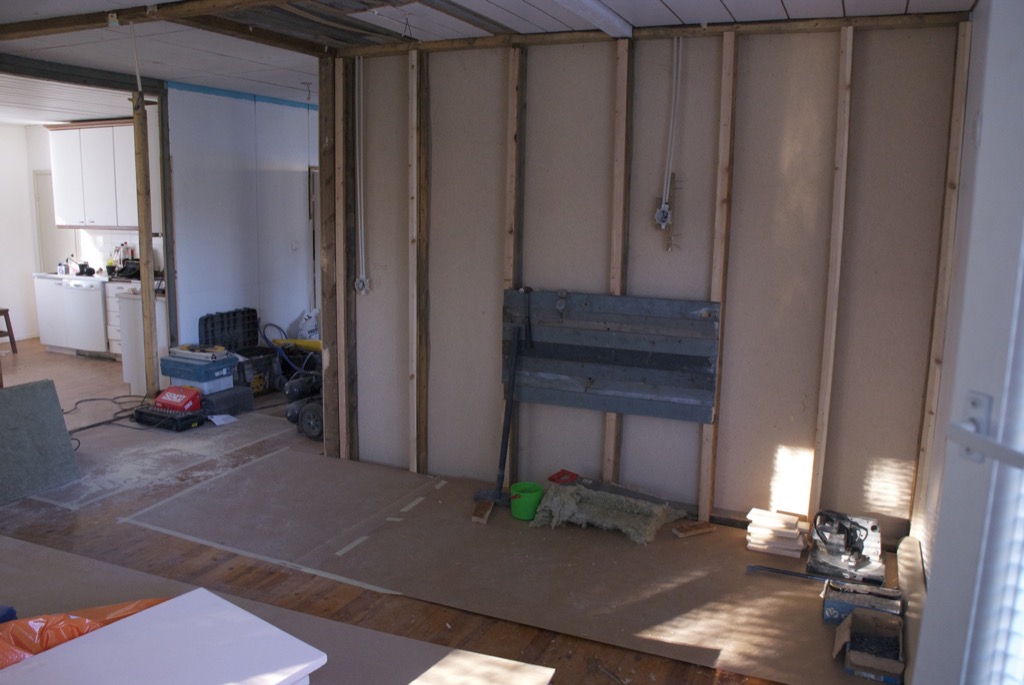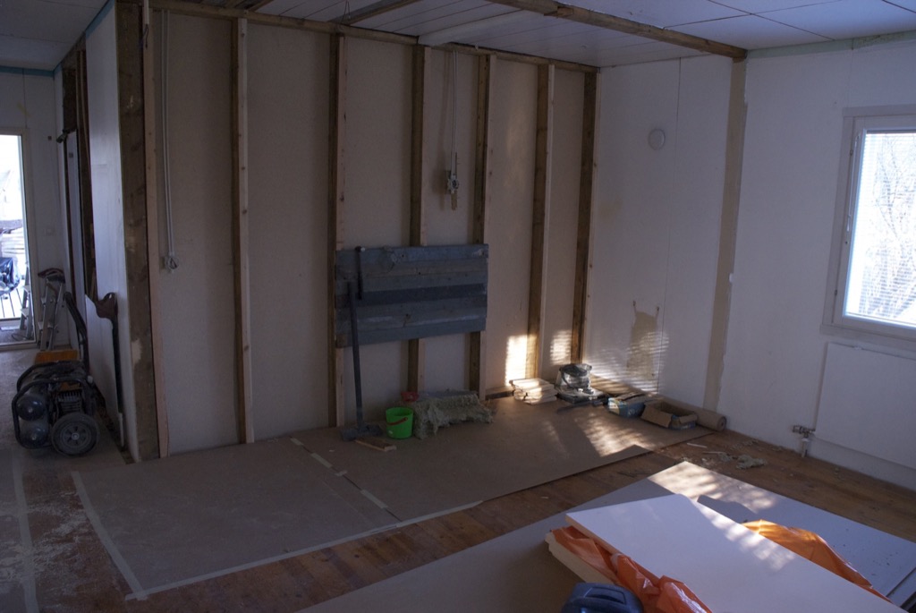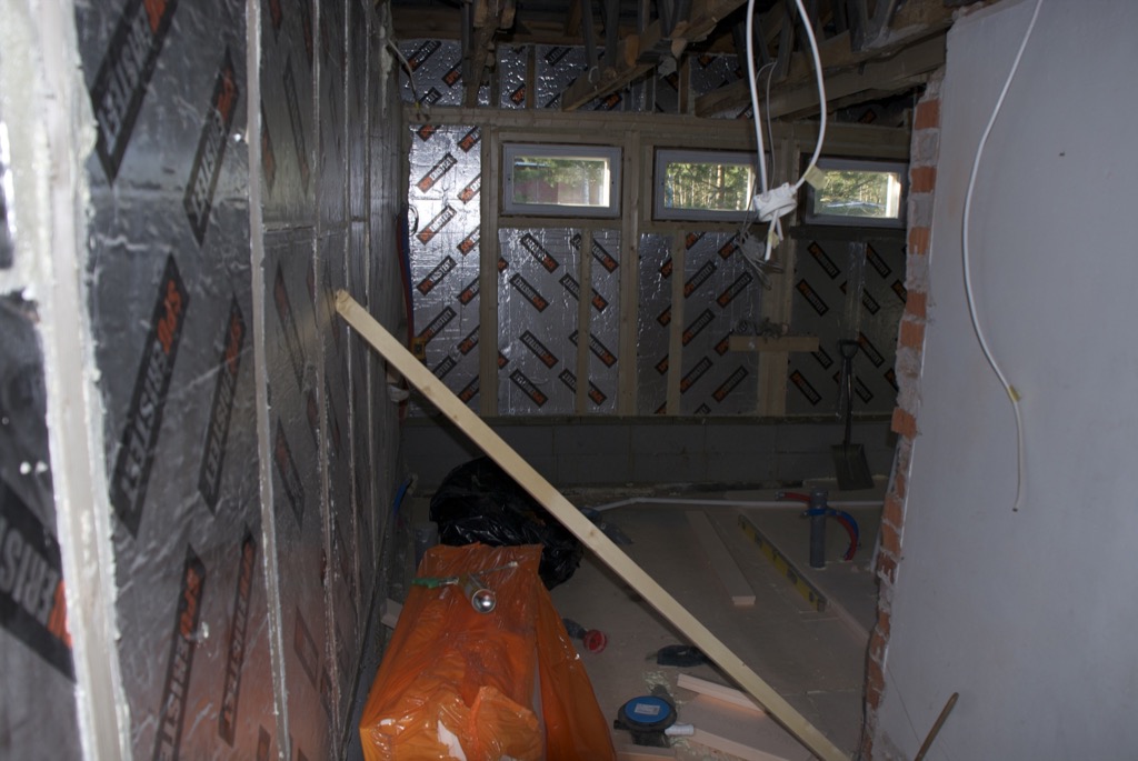 Seinien osalta eristys oli valmis ja höyrysulun viimeistely oli menossa. Kattoon oli ilmestynyt kaksi uutta kattopalkkia, oikeastaan vain pari uutta pätkää. Lisäksi piippu oli vuorattu villalla. Käytännössä tämä oli mahdotonta edellisten tuolien kanssa.