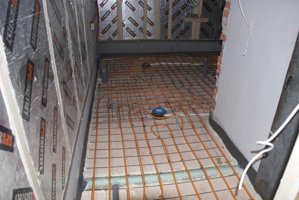 Samalla vedettiin uudet vesiputket suihkulle, pöntölle, lavuaarille, pesukoneelle ja muulle kämpälle. Saatiin pintavedot pois kauhistuttamasta näkymää. Tämän jälkeen hiekkapinta tasattiin ja eristeeksi kasattiin 10 senttiä finfoamia. Kuulemma lämpö pysyy paremmin pesutilojen puolella. Viimeisimpämä lattiasta ylöspäin oli ilmestynyt raudoitus ja lattialämmitysputket. Pannuhuoneen puolelle oli tullut jakotukki, joten lattiat saa mukavuuslämpöön eikä sinne tarvitse syöttää patteriverkoston 80-asteista vettä.