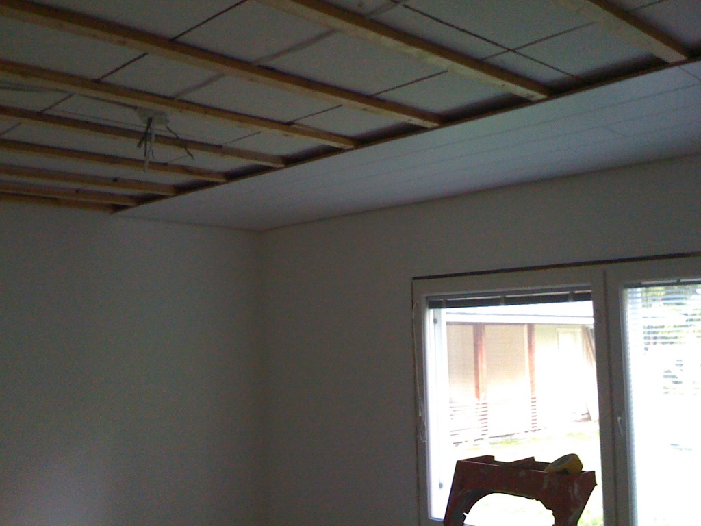 Työ koolausten osalta on aika hidasta, kun koolingit tehdään metritavarasta halkaisemalla. Sitä kun tahtoo tuo nuukuus iskeä. Toisaalta suoraan olohuonetta varten tässä projektissa ei ole hankittu vielä yhtään rakennusmateriaalia. Siis poislukien sähköt, kattopaneelit ja “pintamateriaalit” eli kitit ja maalit. Esimerkiksi koolaukset on tehty vanhasta puusta ja remonttimiehille hankitusta rakennustavarasta. Seinälevyt oli alunperin pesutiloja varten.