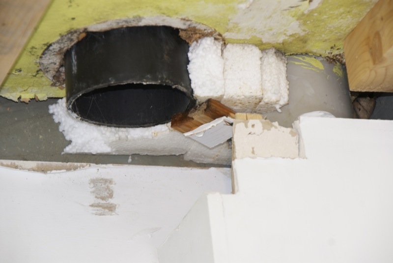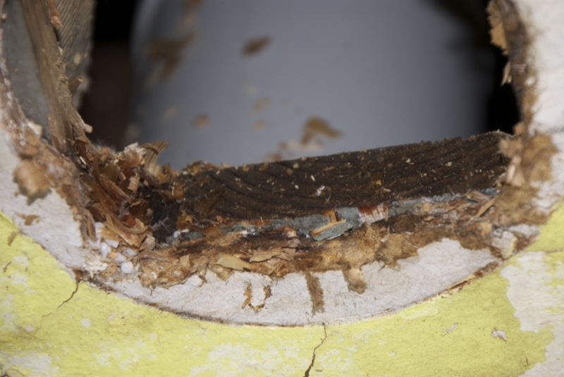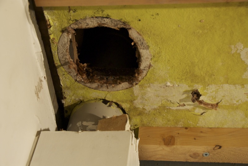 Poistettu putki paljasti, että hormissa oli villaa joten liesituulettimen kautta tapahtunut tuuletus on todennäköisesti ollut todella huono. Itse en sitä päässyt kokeilemaan tai toteamaan. Hyvin todennäköisesti lumi on jossakin vaiheessa repinyt tuota putkea ja koko kotelointia alas jolloin ainakin osa popniiteistä on revennyt ja putki mennyt lyttyyn.