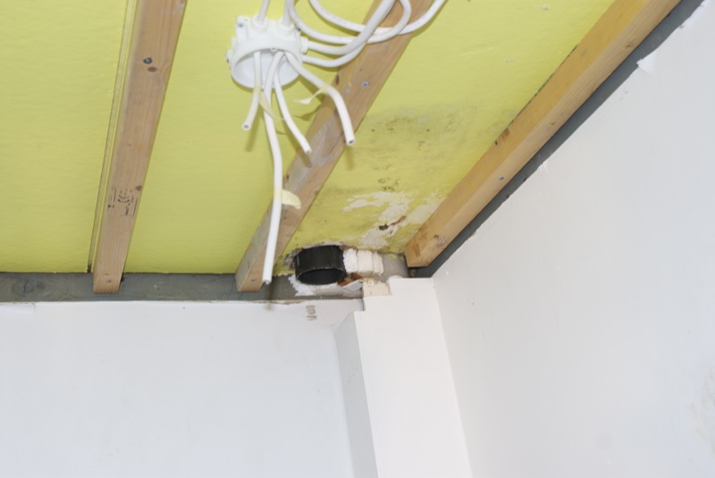 Sisälle siirryin, olisinkohan kahvia mennyt hakemaan ja päätin vilkaista miten velipojan koolaus etenee vessassa. Silloin huomasin kosteutta väärässä paikassa. Nimittäin vessan poistoilmaputken ulkopinnasta tippui vesi.
