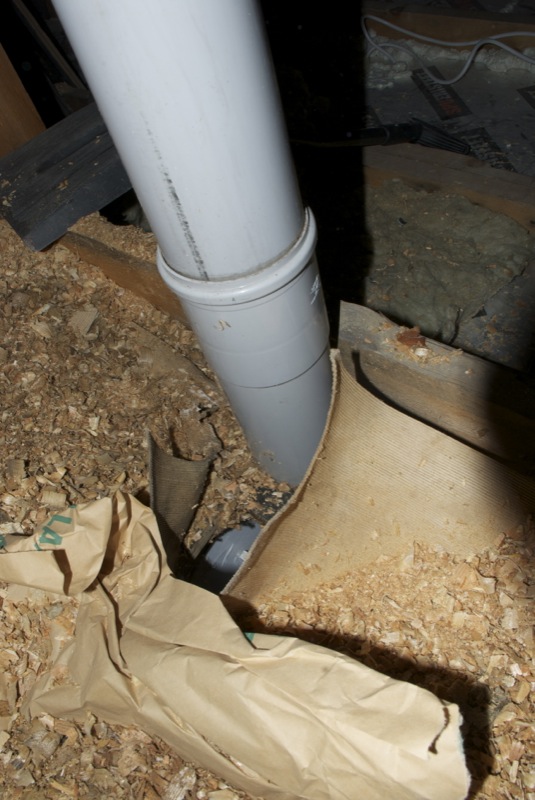 Nappasi pari kuvaa putken alapäästä ja lähdin yläpohjaan (vesisateessa) selvittämään vaurion aiheuttajaa. Käsin kaivamalla selvisi, että muhat (talvella) eristetyn viemärin tuuletusputken juuressa olivat kosteat. Puukolla eristeeksi rullattu villa pois ja alta paljastui kostea putki. Itseasiassa koko villaeriste oli kostea.