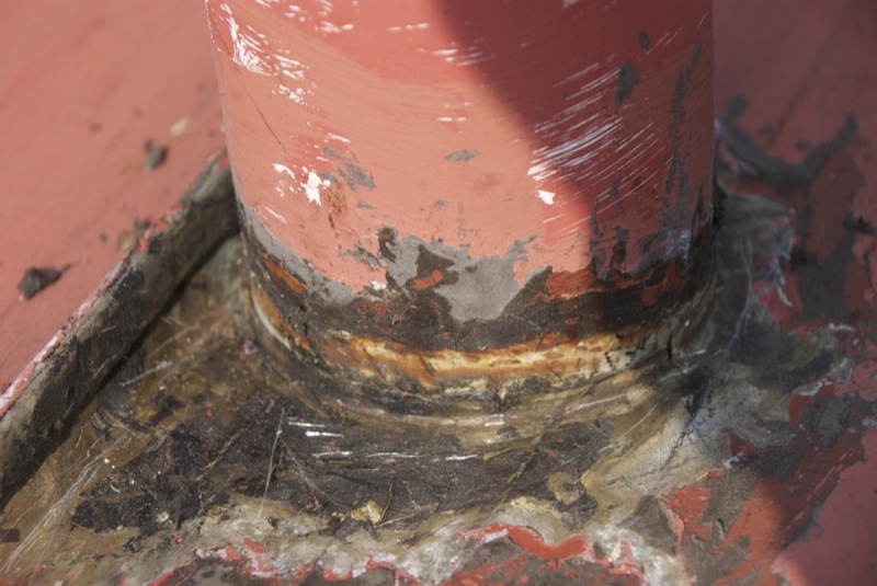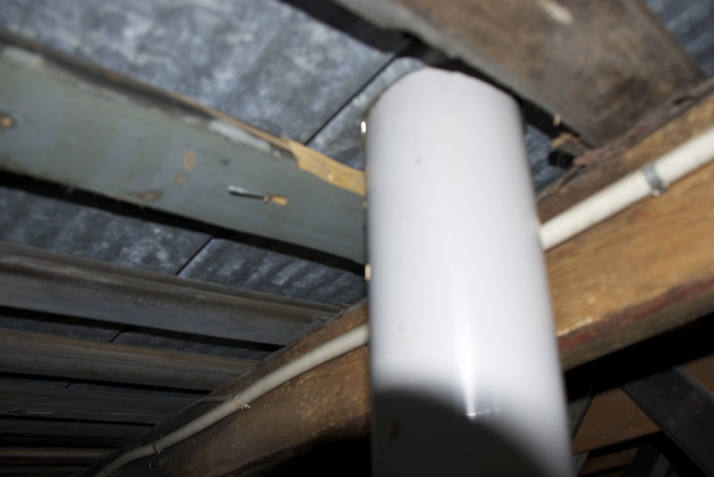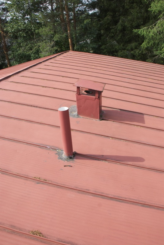 Seuraava aamu, eli tänään sunnuntaina kiipesin isäni kanssa katolle tutustumaan potilaaseen. Ensin yläpohjaan josta nappasin muutaman kuvan putkesta. Taivashan sieltä näkyi. Sitten katolle ja “tiivisteiden” kinppuun. Sekä viemärin tuuletusputki että keittiön liesituulettimen hormin vuoraus olivat surkealla tolalla tiivistyten suhteen. Liesituulettimen hormin vuoraus oli itseasiassa aivan pilalla ja mätä.