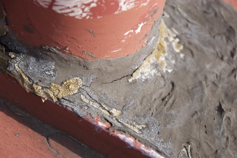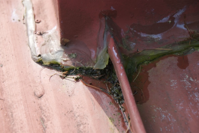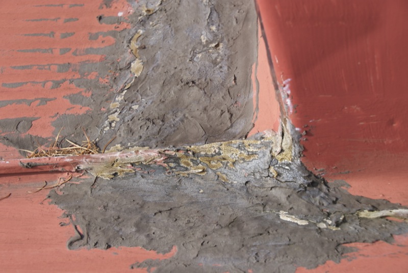 Tiivisteet molempien ympärillä kasvoivat sammalta, mikä oli jo tiedossa aiemmilta katoillaolokerroilta. Silloin en ollut osannut ajatella tiivistysten olevan ihan niin huonossa kunnossa kuin ne olivat. Molemmissa oli pohjana piki tai joku muu vastaava. Tämän lisäksi niitä oli lisätiivistetty jollakin plastic puddingin kaltaisella valkoisella aineella, silikonilla ja jollakin, jonka alkuperää en edes osaa lähteä arvailemaan. Samapa tuo, ne raaputettiin irti.
